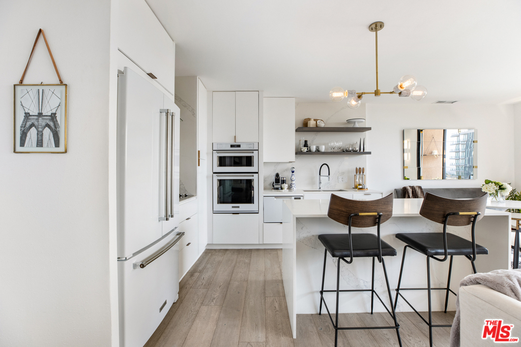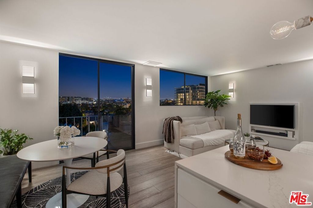 Quite possibly one of the most stylish and contemporary condominiums in the prestigious, Full-Service 100 S. Doheny building, this 7th floor luxury residence delivers the ultimate high-rise living experience. Exquisitely remodeled 1 bedroom, 2 bathroom home displays ample natural light and directs eastward, with spectacular mountain and city views all the way to Downtown LA. Updated finishes include wide plank French oak solid hardwood flooring, new high-quality lighting fixtures, new interior doors, custom closets and bookshelf. Open concept kitchen boasts quartz countertops, a large waterfall island, and modern KitchenAid appliance suite. The full service building offers 24-hour concierge and security services, pool, spa, tennis courts, fitness center, and a dog run. Location central to Four Seasons Hotel at Beverly Hills, Rodeo Drive, Robertson Boulevard Shopping District, Cedars Sinai Medical Center, retail, dining and services.