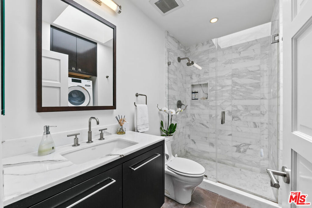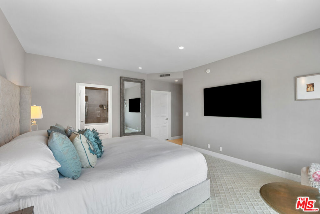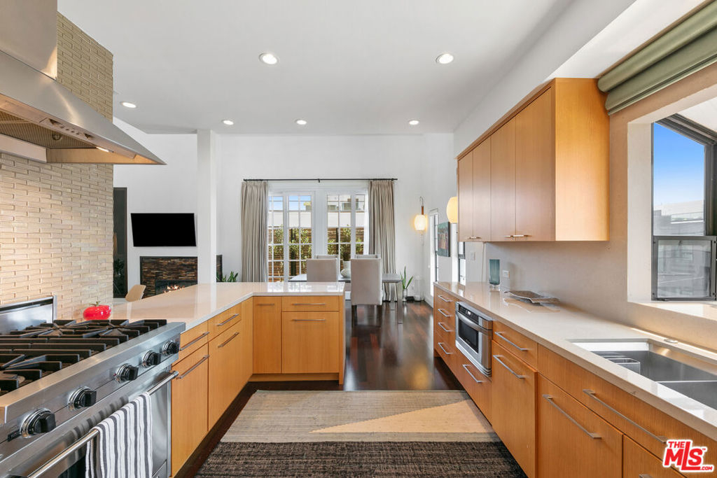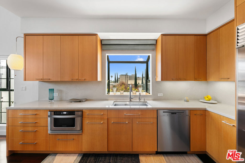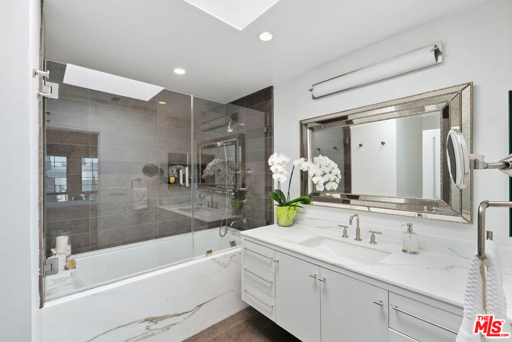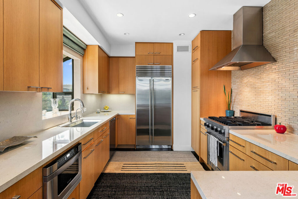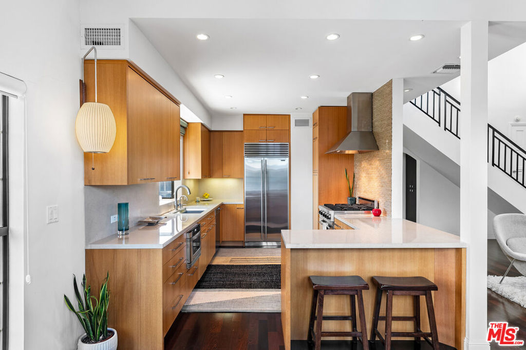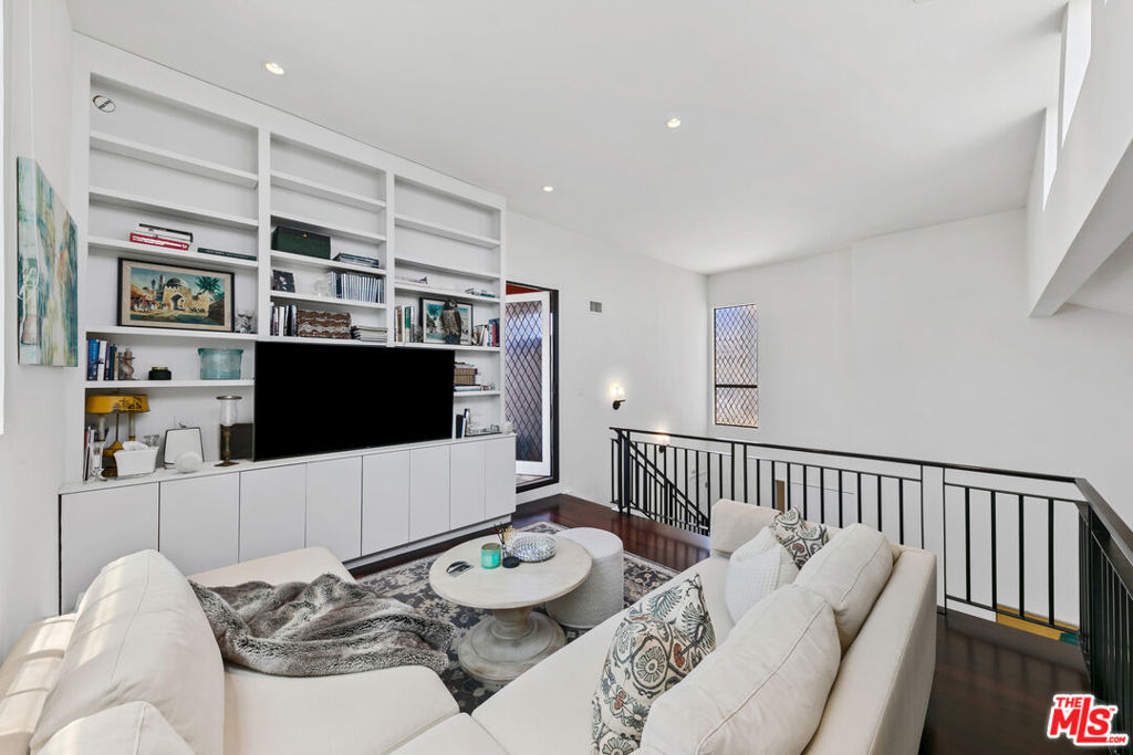 Experience refined living in this rare two-story penthouse at 412 Arnaz Dr. Positioned on the top floor, south-facing corner, this light-filledresidence offers dramatic soaring ceilings, expansive feeling open-concept living, and upscale designer finishes all just moments from Beverly Hills, TheBeverly Center, West Hollywood, and world famous Los Angeles restaurants. Step inside to discover a spacious and sophisticated floor plan, ideal forentertaining. The main level features a modern chef's kitchen with limestone countertops, Sub-Zero refrigerator, Viking range, Miele dishwasher, andabundant cabinetry, all flowing seamlessly into the open living and dining areas. Oversized windows capture brilliant southern light and showcase thehome's stunning volume and scale. The first floor also includes two generously sized bedrooms and two beautifully updated bathrooms, including aluxurious primary suite with a huge cedar-lined walk-in closet and spa-like bath. The second bathroom features a glass-enclosed oversized tiled showerand a large vanity with sleek finishes. In-unit laundry, custom storage, and warm wood floors complete the level. Upstairs, a stylish loft with built-in shelvingoverlooks the living room and offers the perfect space for a home office, library, or media lounge. Step outside to your private covered rooftop deck perfectfor outdoor dining, entertaining, or simply relaxing with expansive city views. A rare bonus storage room off the deck adds even more convenience,offering space few condominiums provide.One of the most unique features of this penthouse is the private two-car garage with direct access to thebuilding lobby an extremely rare amenity in condo living. The garage is equipped with EV charging outlet, offers additional room for storage, and is accessed from the side street.Located in a secure, well-maintained building in one of Los Angeles' most sought-after neighborhoods, this stunning penthouse is Beverly Hills adjacent, close to shopping, fine dining, galleries, and major studios.