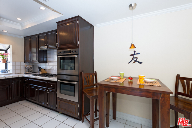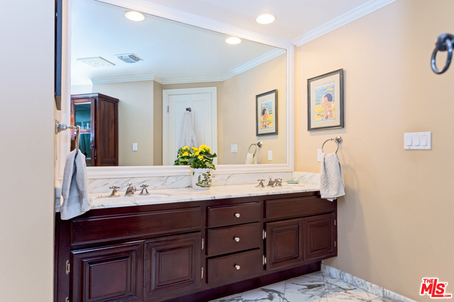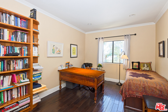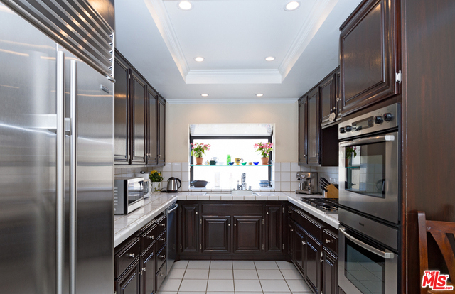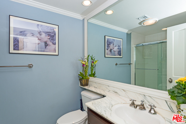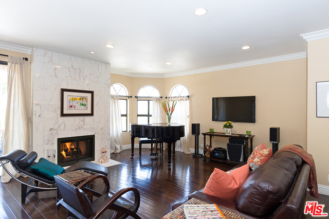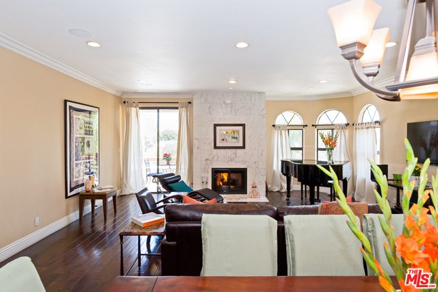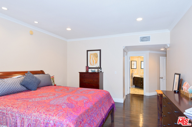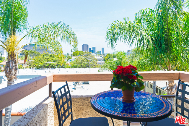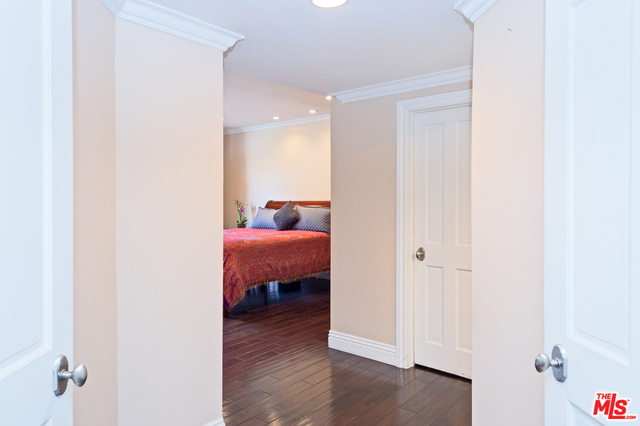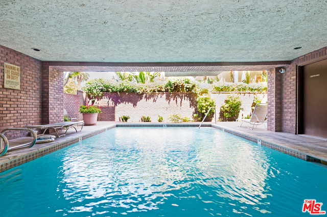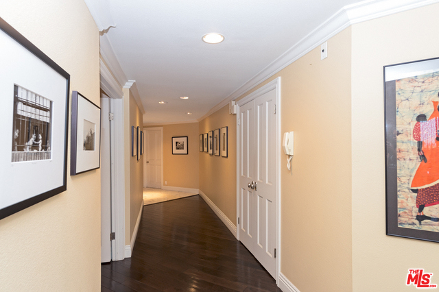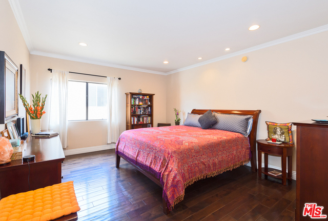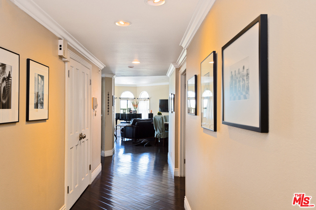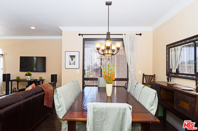 Spacious and sophisticated 2 bedroom, two bath condo in highly desirable Beverly Hills adjacent neighborhood. Top floor, corner unit with gorgeous wood flooring throughout. Bright and beautiful living room and dining area featuring bay windows, high ceilings, crown moulding, recessed lighting, two balconies, wet bar and fireplace. Eat-in kitchen with stainless steel appliances. Oversized, elegant Master suite features walk-in closet and marble dual sink bathroom with shower and separate bathtub. Second bedroom is currently configured as an in-home office/guest room. Second full size bathroom has been updated. This unit also features a separate laundry room, plenty of storage and 2 car security parking. Building amenities include pool, sauna and exercise room. Close to restaurants, shopping, houses of worship, La Cienega Park and Beverly Hills Tennis Courts.