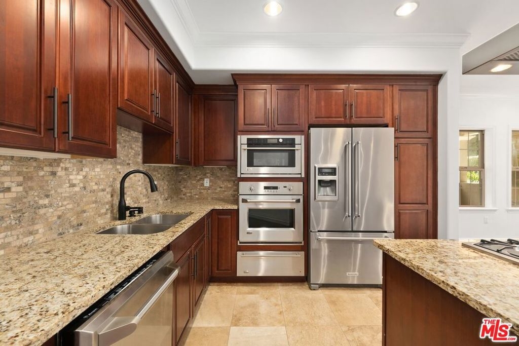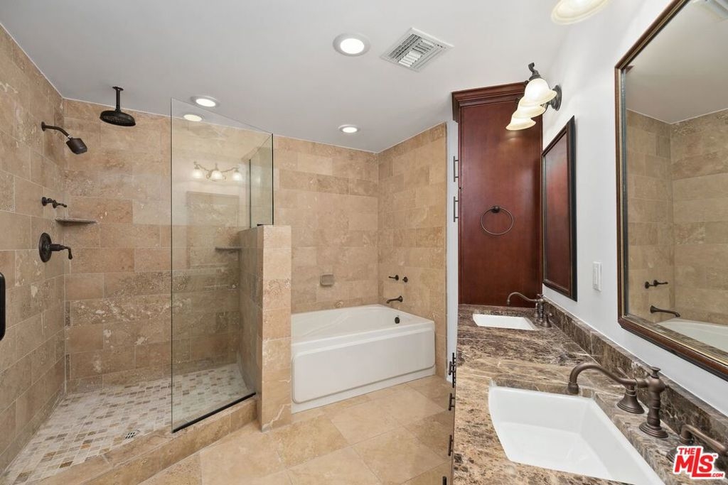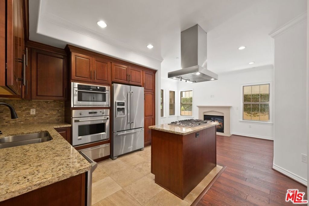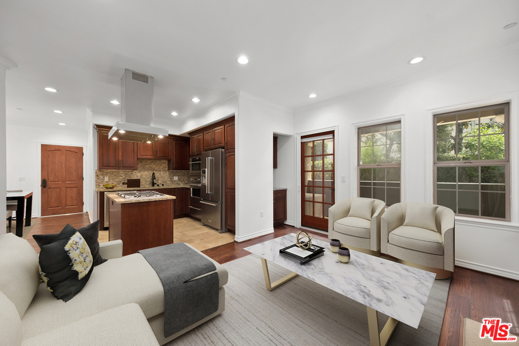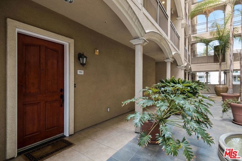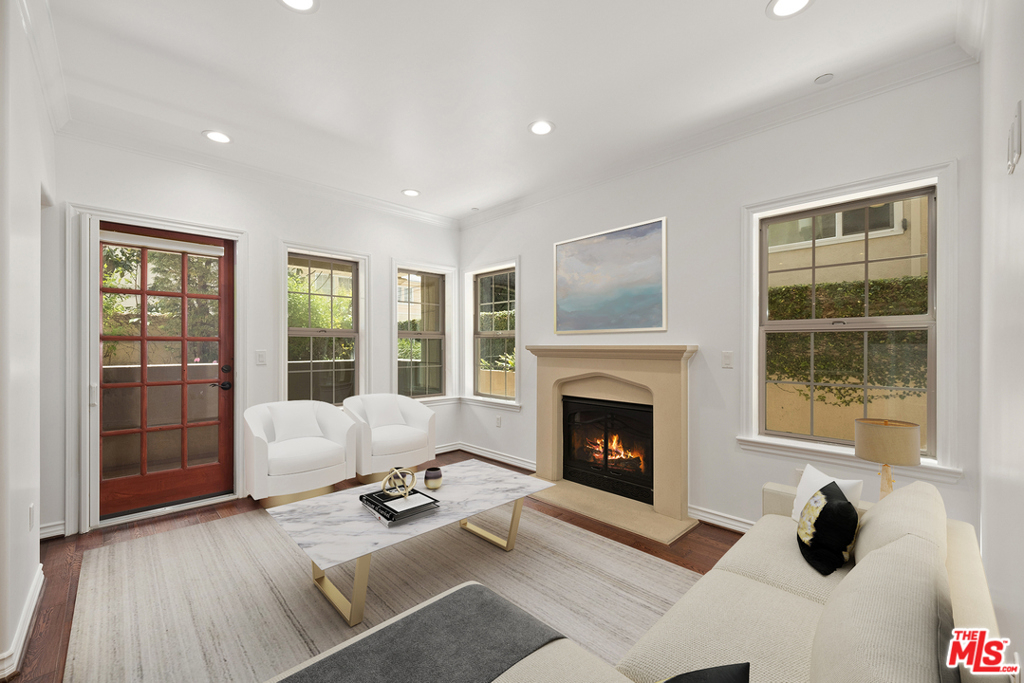 Enter from a charming courtyard filled with oversized potted plants into this luxurious bright and private ground floor condo. Enjoy open plan living complete with hard wood flooring in the living and dining areas and a central chef's kitchen. The living room features an elegant stone fireplace framed by large oversize windows, and leads out to a spacious outside private patio perfect for sipping morning coffee. The chef's kitchen has stainless appliances, gas range and granite countertops, the primary bedroom boasts a huge walk in customized closet as well as ensuite bathroom with dual vanities, bathtub and large separate shower. Recent updates of paint, recessed lighting, tile refurbishment in kitchen, bathrooms/shower. Washer/dryer in unit. Great location, adjacent to Beverly Hills, walk to popular restaurants, shops, cafes of Robertson Blvd., Beverly Center and Cedars Sinai. 2 tandem parking spots plus guest parking. Controlled access. Sundeck on rooftop. Gorgeous and move in ready. Photos are virtually staged.