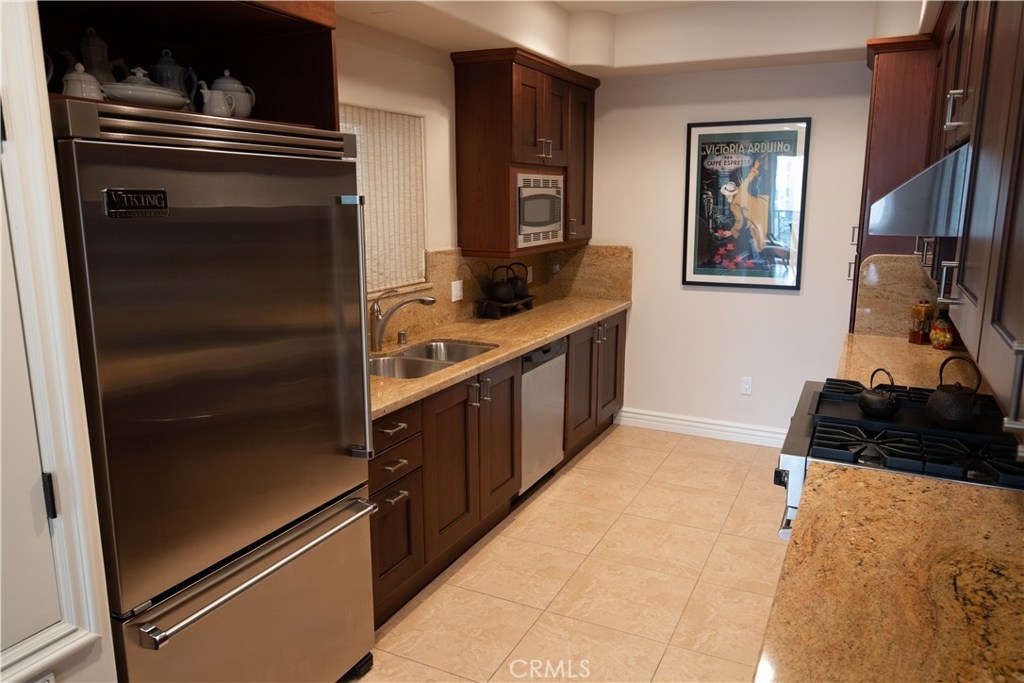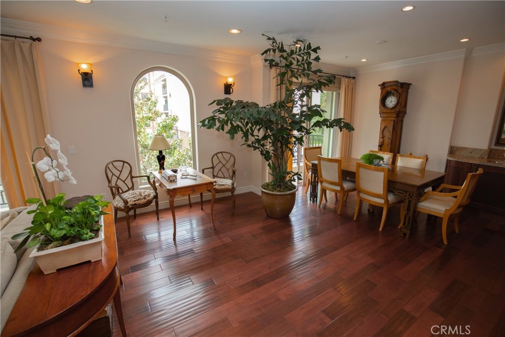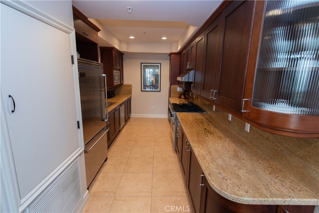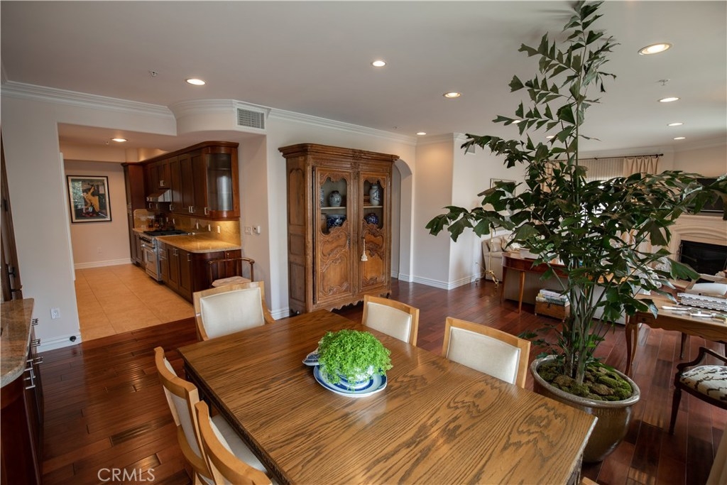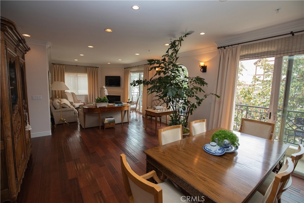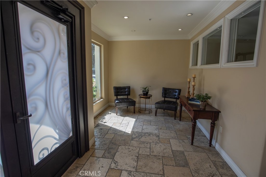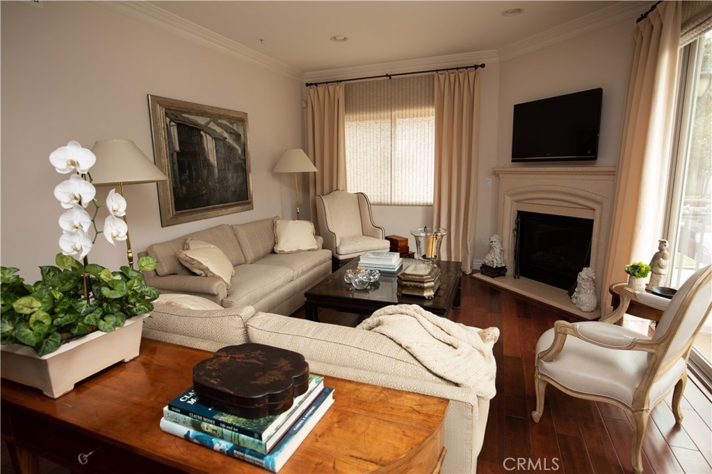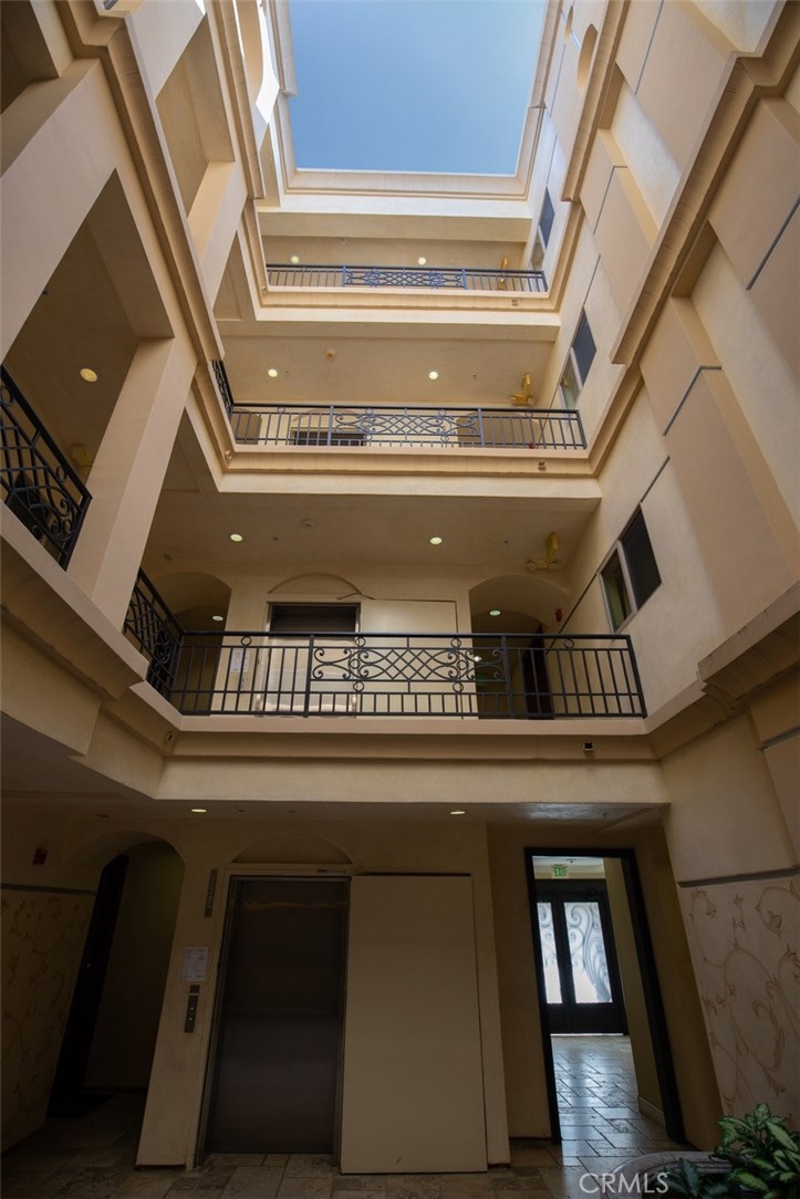 Open floor plan with natural light and high ceilings. Elegant master suite able to accommodate a king bed. Two master closets including walk-in closet. Master bath with Italian noche decorative tile and luxurious shower and tub. Gourmet stainless steel kitchen appliances, granite countertops and Italian cabinetry. Beautiful hardwood floors and marble fireplace. Secure 2 car garage and community exercise room. Washer and dryer inside unit. Courtyard decorated with Venetian plaster artwork and a beautiful open-air skylight. Prestigious location within close proximity to the Beverly center and Cedars Sinai.