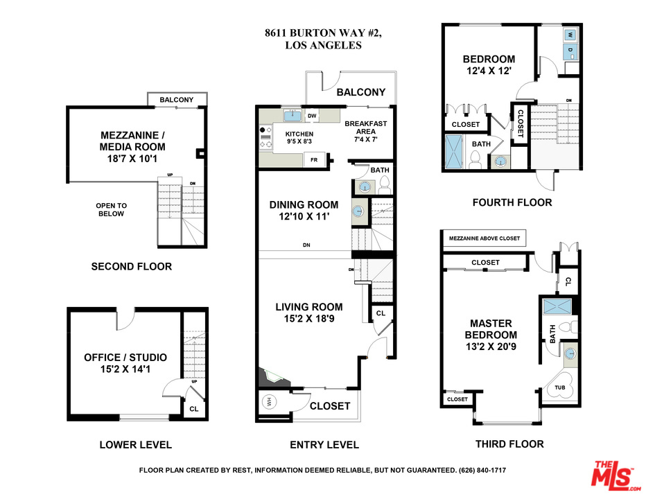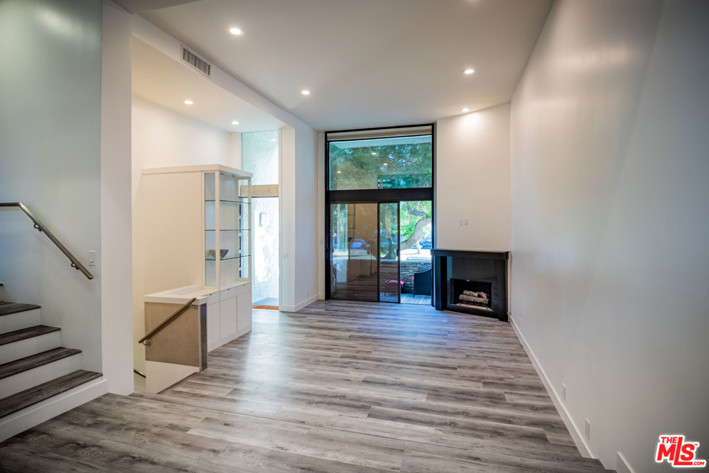 Open the front door and enter the spacious & bright living room with its high, high ceiling. Living room has a huge window & sliding doors to balcony overlooking the green meridian on Burton Way, fireplace, step up dining area with wet bar. Kitchen has built in fridge, gas stove, and room for breakfast table with sliding doors to small courtyard for a grill. Upstairs is a media room or office looking over the living room with a balcony overlooking the community courtyard. Master has tall beamed ceilings, three closets & wonderful en-suite bathroom with special round bath tub, large shower & double sink. Top floor has a laundry room and bedroom with en-suite bath. Enter from the garage into third bedroom, or flex space for office, editing bay, gym or yoga studio. Large private storage area. Two parking spaces side by side. No common area, elevators or lobby.