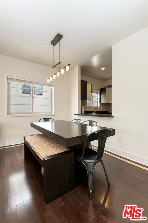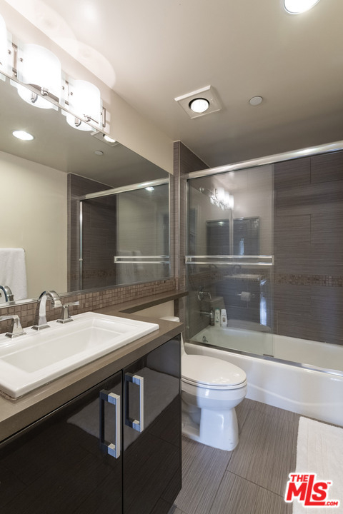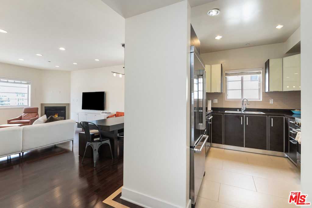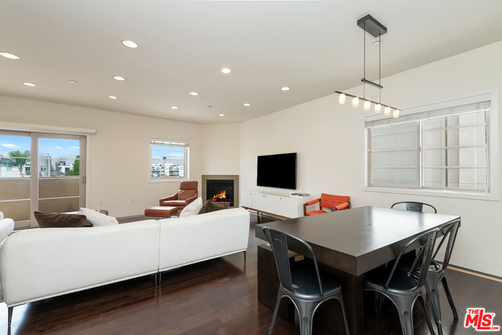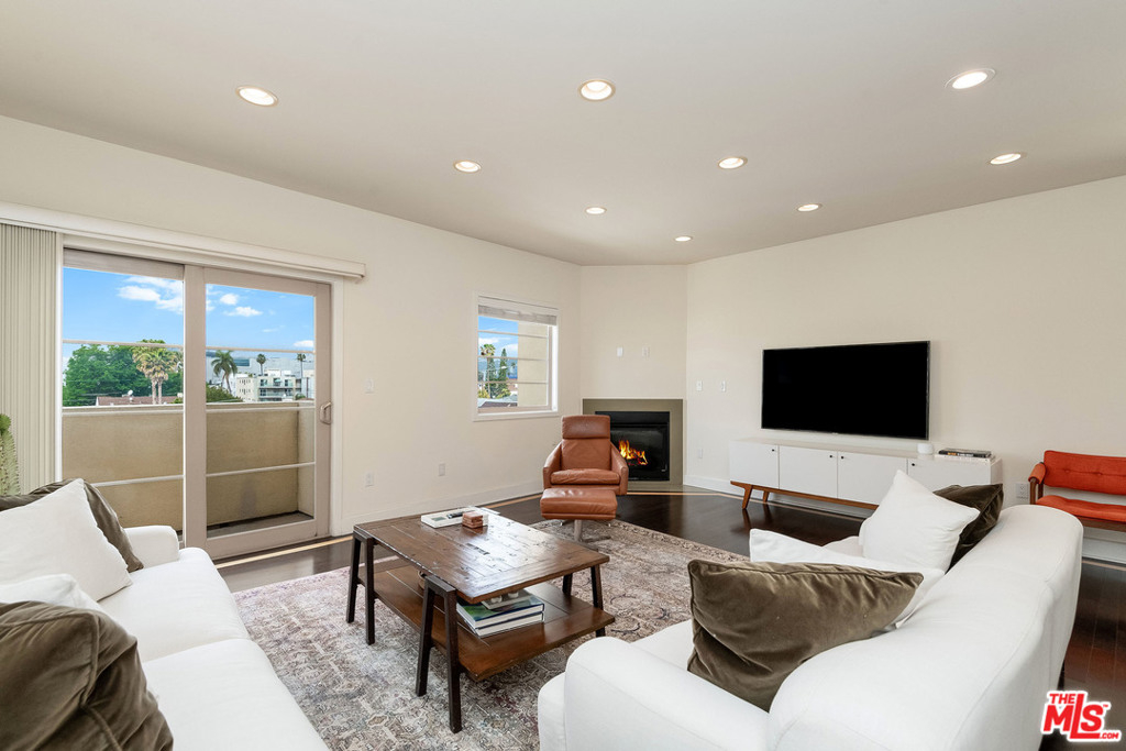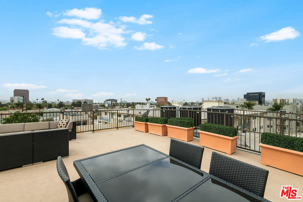 Sleek, chic, and contemporary 3 bedroom, 3 bathroom penthouse with city views in beautiful newer 9 unit building. This bright and spacious condo offers the ultimate in privacy and serenity with only 1 common wall and windows on 3 sides that bring in tons of natural light. Unit boasts a large living room and dining area with ebonized wood floors with inlaid maple color trim, balcony, and fireplace. Kitchen with Italian "Veneta Cucine" cabinetry, accented with upper glass doors and Viking stainless steel appliances, Caesarstone countertops, and designer tiles. Master suite with walk-in closet and second balcony. Sumptuous master bath with Caeserstone counters, Italian lacquered cabinets, double vanities with Kohler sinks, separate tub, and shower. Two additional bedrooms and two additional, similarly-appointed, full baths make this unit perfect for a family or for roommates. Elegant furnished common rooftop deck boasts panoramic views. Secure building with controlled access, gated garage, and guest parking, as well as two tandem, assigned private parking spaces. Amenity-filled neighborhood ideally located close to Beverly Hills, Hollywood, The Grove, and The Beverly Center and a stone's throw to top LA restaurants, shops, and entertainment.