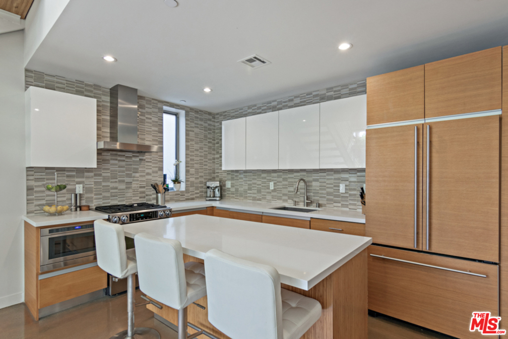 Huge Price Reduction!! Heart of Beverly Grove! Must See! Incredible corner townhome unit, designed by award-winning architects, Pugh+Scarpa. Four-story floorplan with private outdoor space on each level (combined 1900 sqft) provides seamless indoor/outdoor California living at its finest. Main living space has stunning 20-foot ceilings. Living room, kitchen and an outdoor breakfast veranda encased in privacy hedges create a wonderfully, bright and natural living area. Kitchen features a large island, quartz countertops, ample storage and high end appliances. Private rooftop with 270-degree views of the Hollywood Hills and city lights. Outdoor kitchen with quartzite countertops, top of the line gas grill, sink, two refrigerators, gourmet ice machine, and ample seating all handcrafted in Brazilian Walnut. Lush greenery and adjustable up lighting, provide a private sanctuary for a sunny California day, intimate dinner, or gathering with friends around the fire pit.