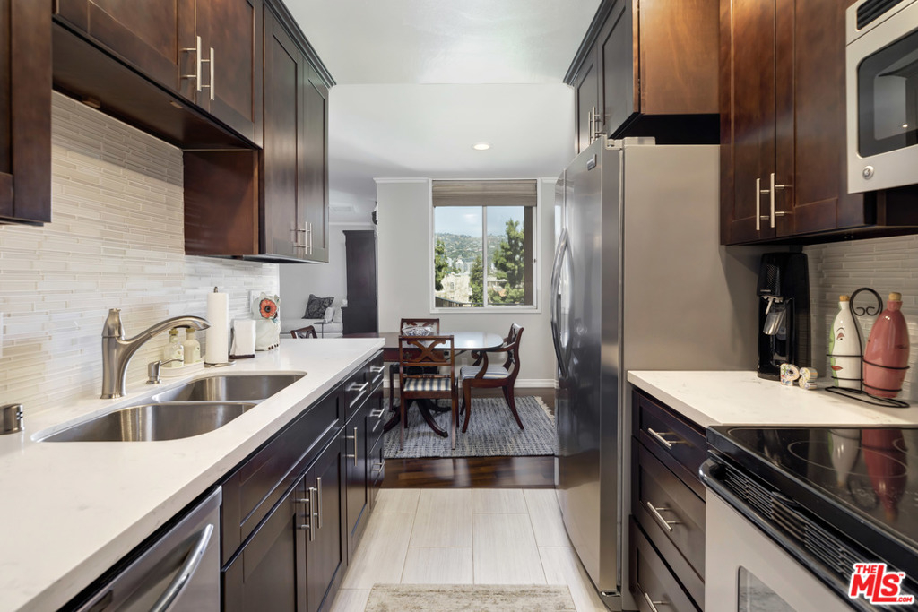 LOCATION LOCATION LOCATION!! Live the amazing LA Lifestyle in the prestigious full-service 100 S. Doheny building. Luxury & convenience in the ultimate location adjacent to Beverly Hills. Fully renovated sleek and modern 1 bed + den / 2 bath unit. Open floor plan with custom built-in bar and wine cooler. Corner unit with beautiful VIEWS VIEWS VIEWS of the Hollywood Hills and Downtown LA from every window. Chef's kitchen includes all stainless steel appliances and loads of cabinet and counter space, flowing smoothly into the dining room and entertaining area. Large master bedroom with excellent closet space and updated bath. Laundry facilities on each floor. Unit includes two tandem parking spaces. Building has 24-hour security guard, low HOA dues and amenities that include: Concierge, Pool, Spa, Gym, Tennis court, Dog Run, and covered parking. Close to Beverly Center, Cedars Sinai Hospital, 4-Seasons Hotel, West Hollywood and trendy Robertson Blvd. restaurants and shops. Welcome Home!