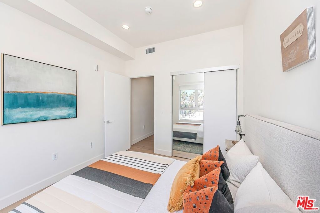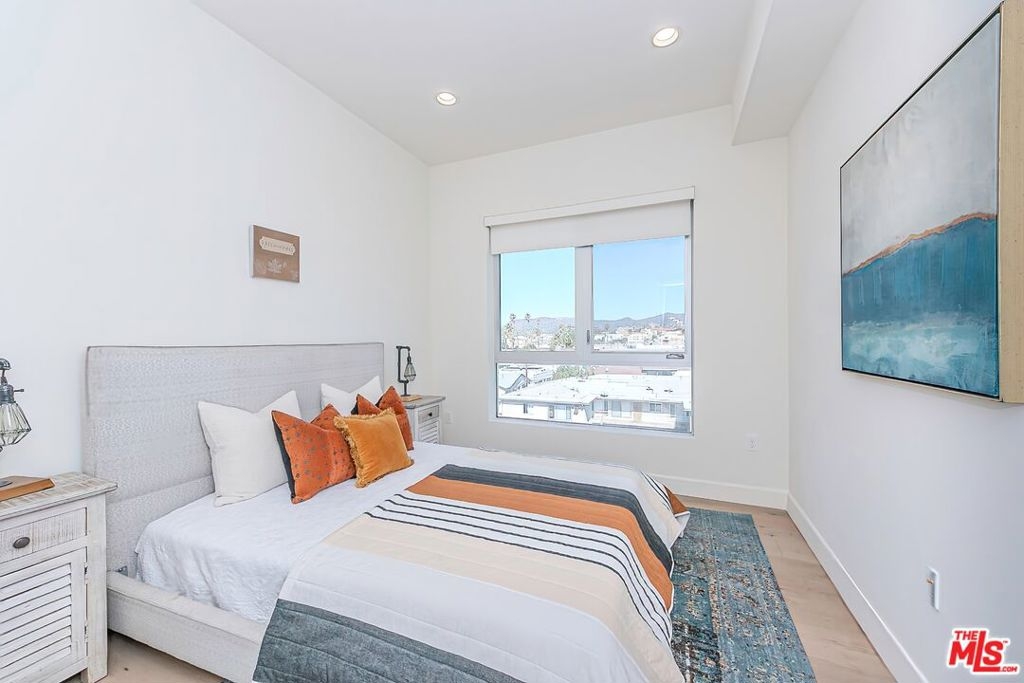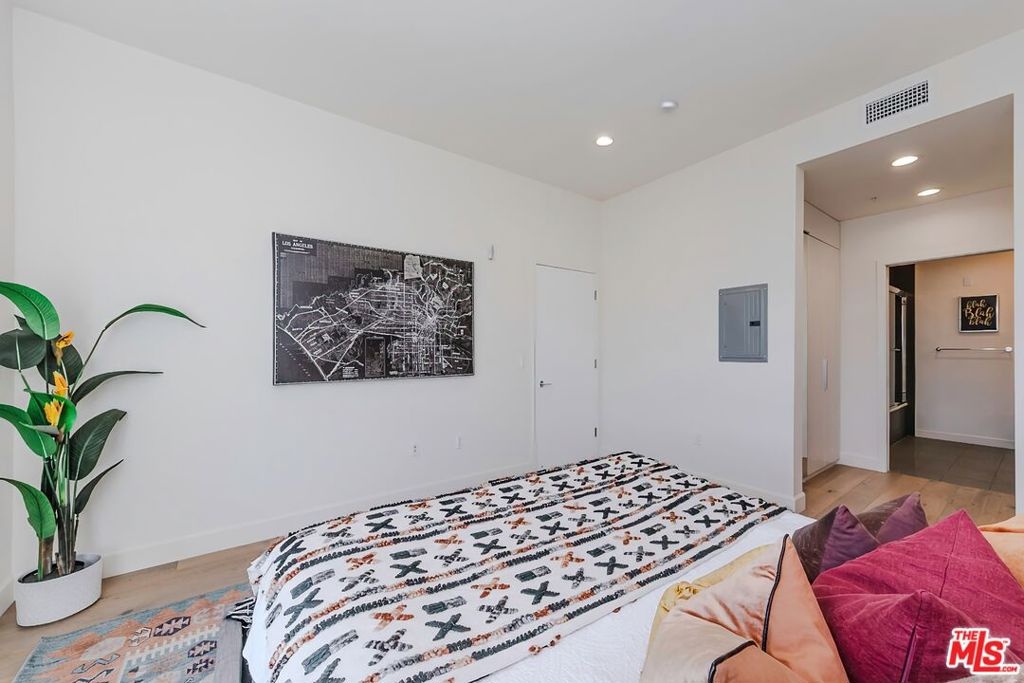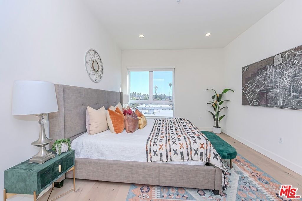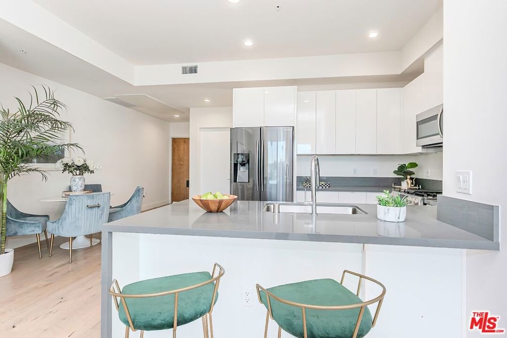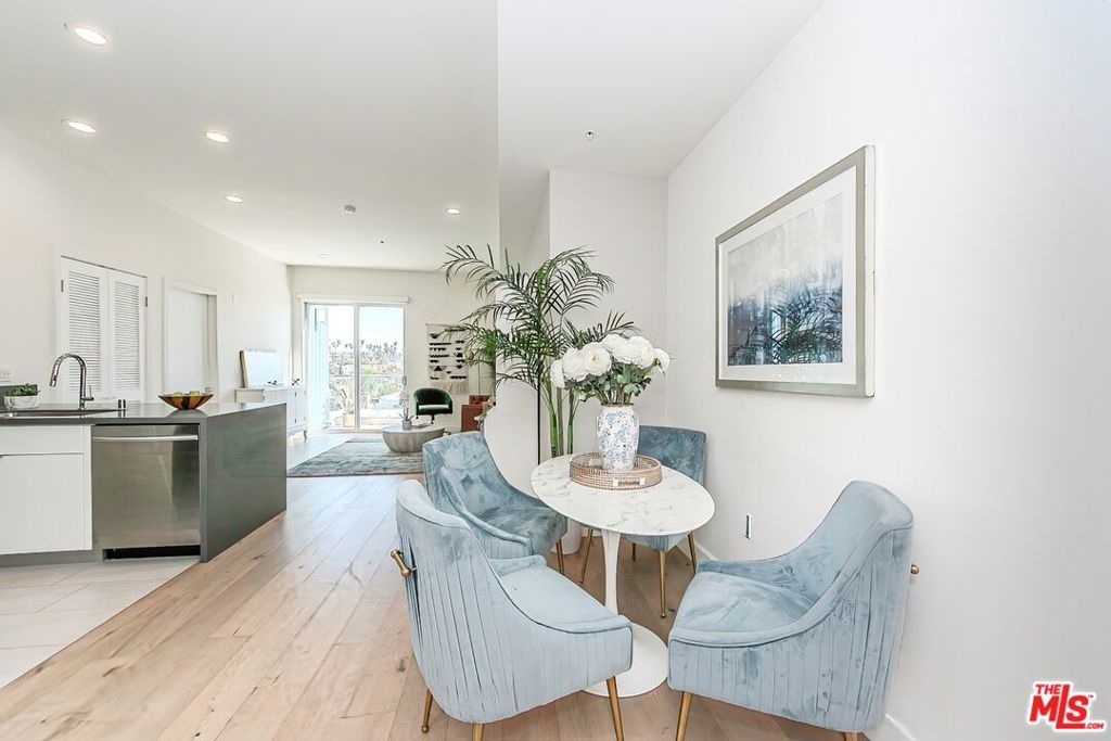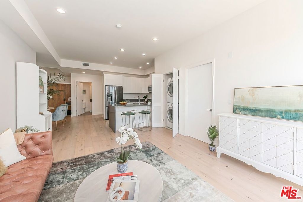 A contemporary oasis featuring sleek wood flooring, fresh paint, and elegant recessed lighting, this top-floor northeast corner unit offers high ceilings and breathtaking panoramic views of the DTLA skyline and Hollywood Hills. With no shared walls, it ensures unmatched privacy. The end unit also provides generous extra storage conveniently located right next to the residence and a bright, open layout.The modern kitchen boasts white cabinetry, stainless steel appliances, a gas range, bar seating, and abundant counter space. It seamlessly connects to the dining area and living room, which opens to a private balcony through a glass doorperfect for enjoying the views of palm trees and L.A.Built in 2017, Mari Villa offers two dedicated gated parking spaces equipped with a private EV charger connected to the unit's individual meter. Side By Side Parking. The charger is compatible with both NACS (Tesla) and standard non-Tesla connection incredibly valuable and rare feature in Koreatown, making it a huge asset for any EV owner. Water, gas, and electricity are all individually metered, giving residents full control over their utilities. The building also provides access to eight gated guest spots, and the HOA covers cable TV, high-speed internet, nightly security, trash, and building maintenance for a worry-free lifestyle. Ideally situated just minutes from Larchmont Village, Hancock Park, Hollywood, Downtown LA, and only a short drive to the 101 freeway, this refined residence embodies sophisticated living in the heart of Koreatown.