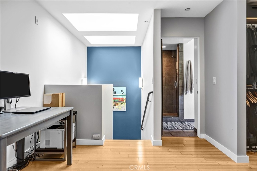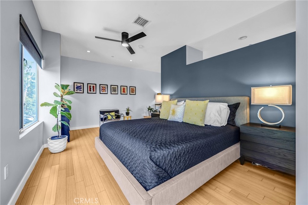 Welcome to 1120 N. El Centro Ave #5, a rare, design-forward residence in the heart of Hollywood. This stunning residence offers a sleek, modern design with an open- concept living space, high ceilings and soaring 18-foot windows in the living room. The home is filled with natural light and framed by lush greenery and a magnificent mature tree—creating a serene, retreat-like atmosphere rarely found in urban living. Thoughtfully designed across three levels, the home offers both functionality and separation of space: First Level: Open-concept common living area featuring modern kitchen, including Bertazzoni range, quartz countertops and stainless steel appliances, comfortable living and dining space, along with a convenient half bath—ideal for everyday living and entertaining. Second Level: Ensuite guest bedroom with access to a large private balcony surrounded by mature bamboo, providing natural privacy and shade- a serene place to relax and recharge. Third Level: A spacious primary suite with an open-concept closet area and a large ensuite bath complete with a soaking tub and walk-in shower—your own private retreat above it all. Adding to its uniqueness, the residence includes: a generous front yard patio set against a lush bamboo backdrop, offering seamless indoor-outdoor living and an uncommon level of privacy for a Hollywood loft, private gated entrance with direct street access and secure underground parking with two tandem spaces and guest parking. Located within a well-maintained community within walking distance to Hollywood Farmers Market, Larchmont Village shops, entertainment, studios, and cultural hotspots, this home delivers the perfect blend of vibrant city access and tranquil escape. A truly one-of-a-kind residence for the sophisticated buyer who views home as an expression of individuality.