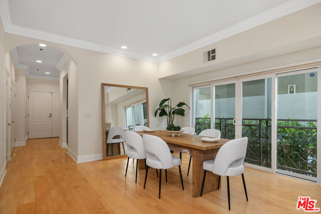 This refined elegant building is located near renown shops and restaurants in the heart of Brentwood. The luxurious single story condo features a formal entry leading to an expansive, light-filled living room/dining area lined with high ceilings, crown moldings, hardwood floors and a stone fireplace. The gourmet kitchen is equipped with custom made cabinets, granite countertops and stainless steel appliances. The primary bedroom offers a peaceful retreat with ample closets and a private balcony. The large ensuite bath has a spa-like tub, separate glass enclosed shower and double sinks. The second and third bedrooms have large closets and an adjoining bath, and provide versatile spaces that can accommodate guests or can be used as home office, hobby rooms or fitness areas. In unit laundry, AC, and plantation shutters throughout. Two assigned parking spaces in a secure garage.