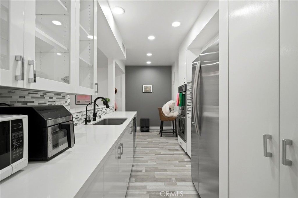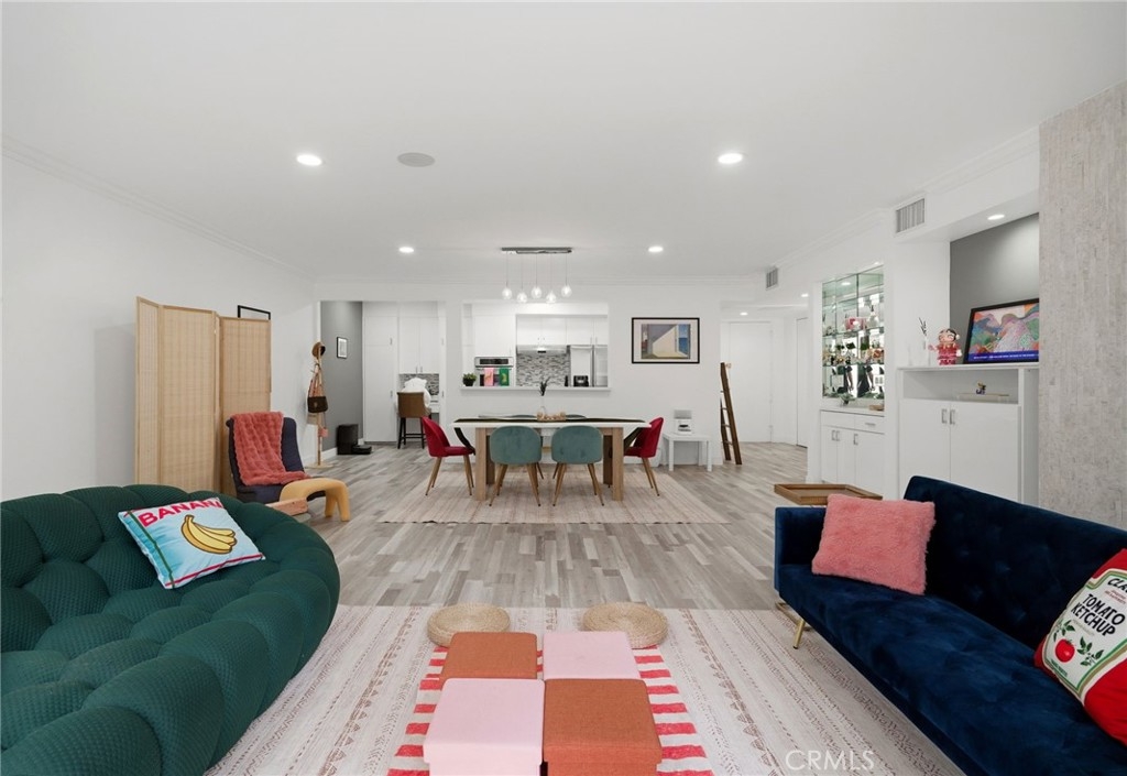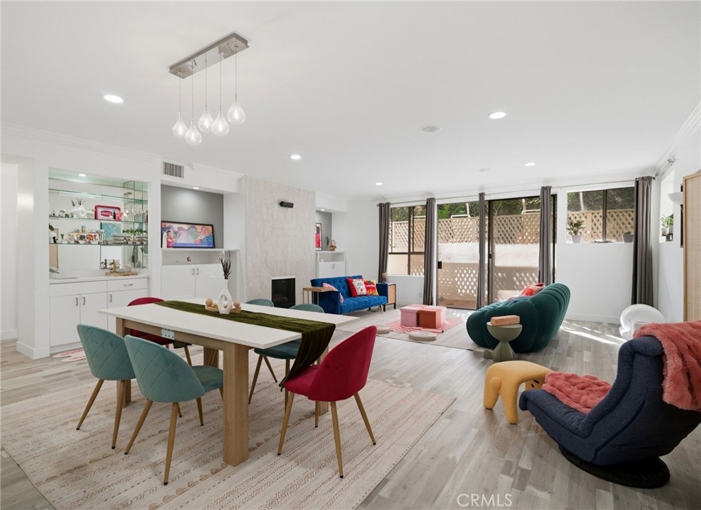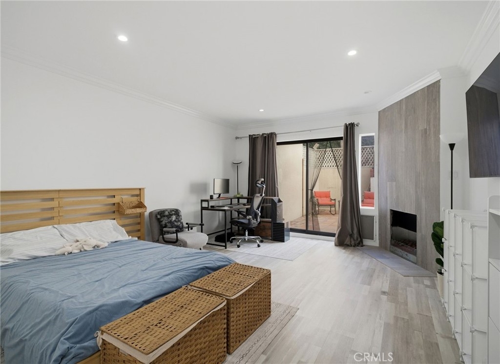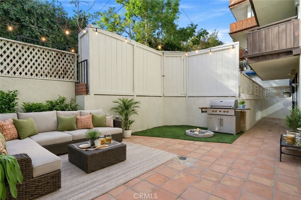 Welcome to 1277 Beverly Glen Blvd #107, a beautifully remodeled 2-bedroom, 2-bath residence ideally located in the highly desirable Westwood / Century City corridor. A rare blend of space, style, and convenience, this home offers the feel of a private retreat with the ease of condo living. A striking double-door entry opens to a welcoming foyer with a generous coat closet, setting the tone for the spacious, open-concept floor plan beyond. The light-filled living areas are thoughtfully designed for both everyday living and entertaining. High-end finishes include Italian wood-look porcelain tile, quartz countertops, stainless steel appliances, dimmable recessed LED lighting, and a theater-quality surround sound system. The living room features a cozy fireplace, crown moldings, and a stylish wet bar—perfect for hosting. The expansive primary suite is a true retreat with its own fireplace, a walk-in closet with custom built-ins, and a resort-style bathroom featuring a custom double-sink vanity, dual rainfall and standard shower, and an oversized Jacuzzi soaking tub. One of the most exceptional features of this residence is its oversized private patio, offering approximately 500 square feet of outdoor space—a rare find in condo living on the Westside. Accessible from both the living room and primary suite, the patio functions as an extension of the home, creating a seamless indoor-outdoor lifestyle. Ideal for entertaining and pet-friendly living, the patio offers space for outdoor dining, lounge seating, grilling, and daily pet use—delivering the feel of a small backyard with the convenience and security of condominium living. This versatile outdoor space is especially appealing for buyers seeking private outdoor access in an urban setting. Additional highlights include a well-appointed second bedroom and bath, ample storage, and thoughtful details throughout. The community offers a pool and fitness center, with easy access to Westwood Village, Century City, UCLA, shopping, dining, and major commuter routes. Move-in ready, light-filled, and truly one of a kind—this is refined Los Angeles living at its best.