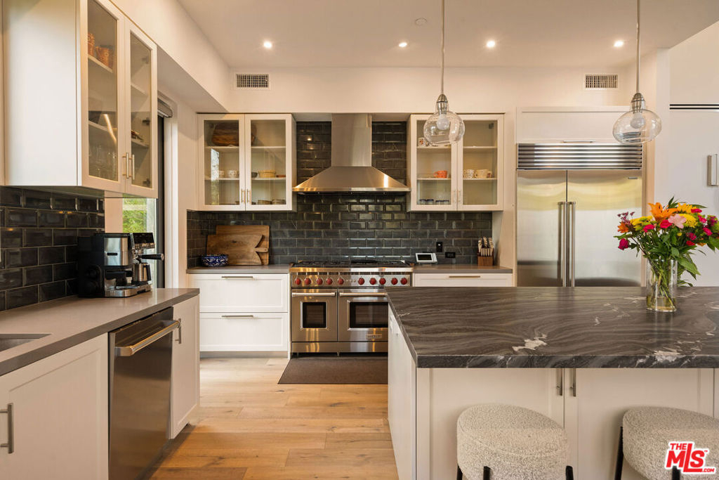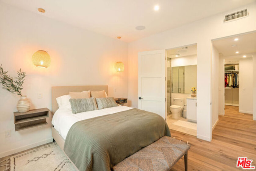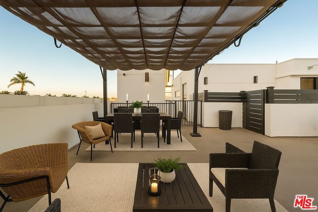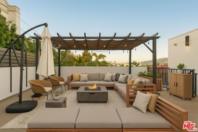 Perched on the border of Century City and Beverly Hills, this penthouse suite is a refined statement in modern elegance. One of only four residences in a boutique 2019-built building, the home offers privacy, style, and seamless indoor-outdoor living in one of LA's most coveted neighborhoods. Direct elevator access, programmed with private control, opens into a sun-drenched open layout, where soaring ceilings, wide-plank white oak floors, and clean architectural lines set the tone for a sophisticated lifestyle. Anchoring the main living space is a stunning chef's kitchen, fully outfitted with Sub-Zero and Wolf appliances, extensive cabinetry, and a dramatic waterfall island that doubles as a conversation centerpiece. The living and dining areas unfold beneath double-height ceilings, wrapped in soft natural light and perfectly designed for both intimate evenings and effortless entertaining. Three ensuite bedrooms offer hotel-level comfort, each with custom built-in closets and serene designer bathrooms. The primary suite is a sanctuary of calm with spa-inspired finishes and elevated details throughout. Upstairs, the private mezzanine level leads to a spectacular rooftop deck, accessible directly from inside the unit. Framed by a custom privacy fence and pergola, this open-air oasis invites you to dine, lounge, and entertain while soaking up sweeping city views under the stars. Additional highlights include secure gated parking, a sleek in-building fitness center, and solar energy integration. With its modern amenities and thoughtful design, the residence balances calm luxury with vibrant city living. All of Beverly Hills and Century City are at your doorstep: stroll to the Westfield Century City Mall, world-class dining and shops, Hillcrest Country Club, Roxbury Park, and more. This penthouse is an invitation to live beautifully at the very top of it all.