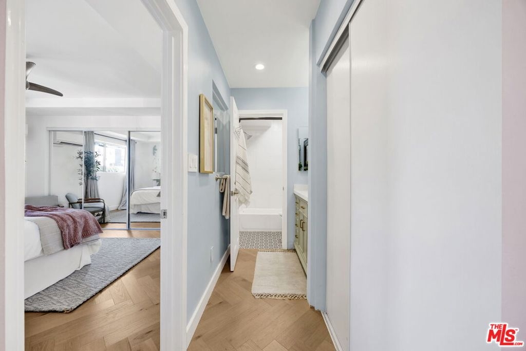 Welcome to this beautifully remodeled 1-bedroom, 1-bathroom condo offering a stylish blend of modern updates and functional design. The open layout is filled with natural light and features herringbone natural-hardwood floors, a convenient study nook, and recessed lighting. The updated kitchen is complete with newer cabinets, stainless steel appliances (refrigerator, dishwasher, microwave, and electric stove), and a reverse osmosis water filtration system. The bathroom showcases Neo-Moorish tile, a modern vanity, and a TOTO toilet with bidet attachments. Additional upgrades include in-unit laundry, new A/C split systems, a designer ceiling fan, and a coffered ceiling in the bedroom. A private balcony provides an outdoor extension of the living space. Located in the heart of Hollywood, with a partial view of the iconic Hollywood Sign landmark, this residence offers walkable proximity to dining, entertainment, and shopping.