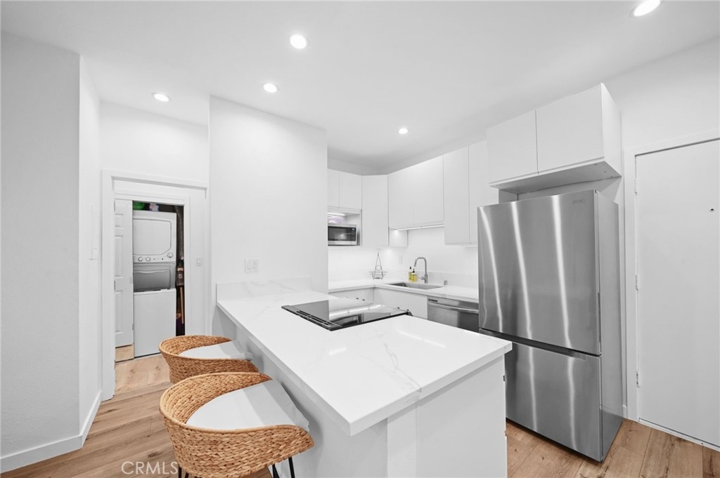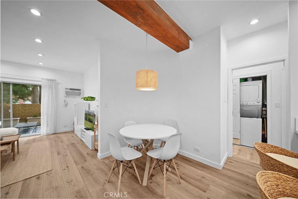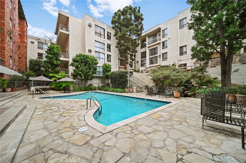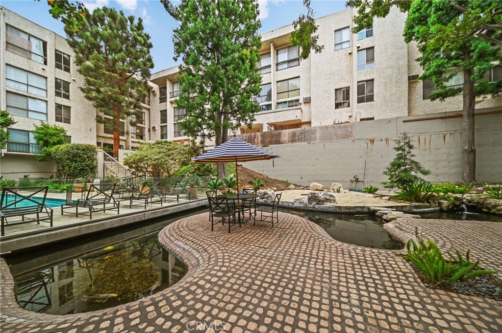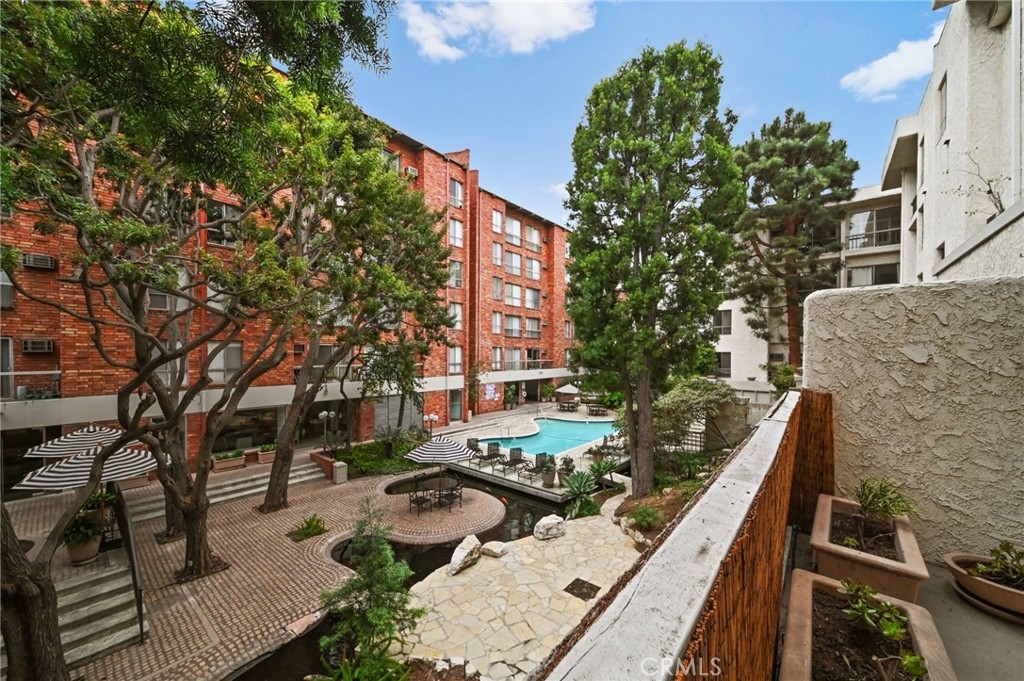 Discover the epitome of urban living in this stunning, fully remodeled 1-bedroom, 1-bathroom condo. This home, located in the heart of Westwood, offers the perfect blend of style, comfort, and convenience. Step inside to an inviting space featuring new flooring, stackable washer-dryer and fresh paint, and a modern kitchen with sleek design, soft-close drawers, under-cabinet lighting, and brand-new appliances. The spacious living area features a stylish open beam ceiling and recessed lighting, creating a warm and inviting atmosphere. Step outside onto your expansive 24x8 patio balcony, overlooking a serene courtyard with a koi pond and pool, providing the perfect escape. Residents enjoy access to a range of luxurious amenities, including 24/7 security, a state-of-the-art gym, a sparkling pool, a jacuzzi, a steam room, a redwood sauna, a conference center with a catering kitchen and separate lounge. Enjoy the convenience of on-site EV car charging and an assigned parking spot and bicycle storage. Directly across the street from The Colony is Westwood Park, offering tennis and basketball courts, soccer fields, and a dog park. With its prime location near UCLA, Westwood Village, Brentwood, Beverly Hills, and the future Purple Line subway station, you'll be just moments away from world-class dining, vibrant nightlife, and premier shopping. Don't miss this opportunity to own a piece of Westside paradise. Schedule your showing today!