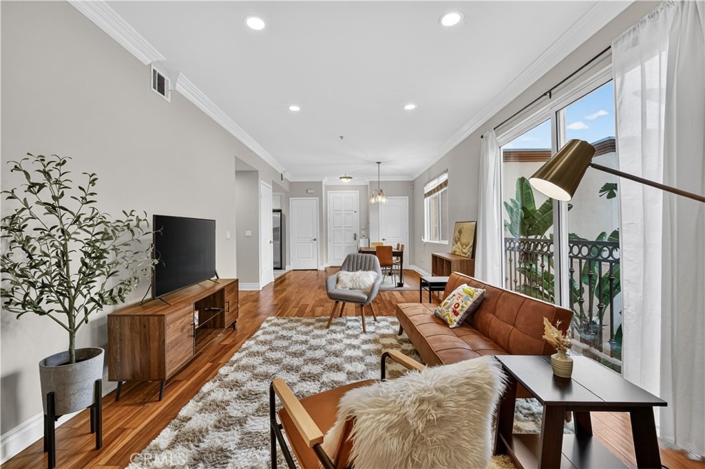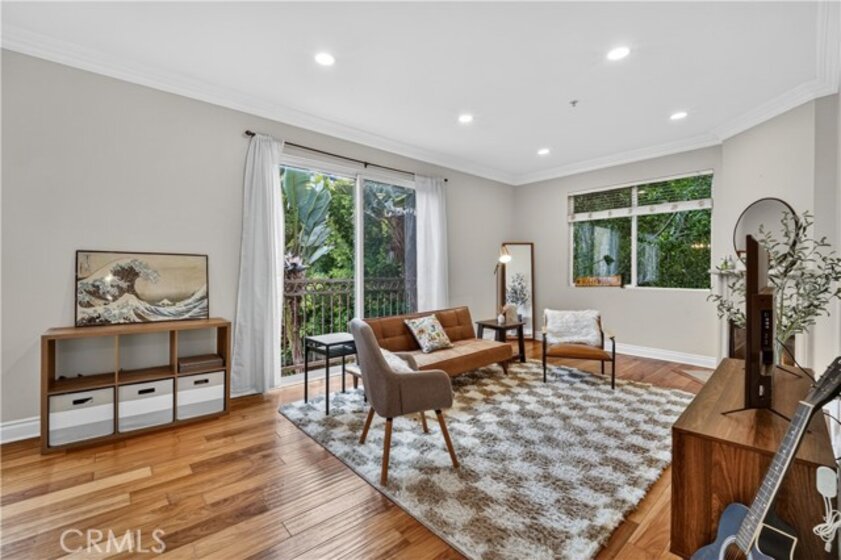 Exceptional top floor penthouse residence filled with charm, surrounded by lush greenery, and offering privacy at its finest. Tucked away as a corner unit at the rear of the building, this home feels distinctly separate and elevated. Upon entry, you’re greeted by abundant eastern sunlight streaming through oversized windows and sliding doors, illuminating the formal living and dining areas. Soaring ceilings and rich hardwood floors enhance the sense of volume and refinement. All three bedrooms are thoughtfully positioned along a wide hallway, each generously sized with built in closets and organizers. The master suite features a spacious walk in closet, while both bathrooms include soaking tubs. Ample storage is found throughout, including four closets- one ideally suited as a kitchen pantry. In unit laundry adds everyday convenience and ease. The building offers subterranean parking with ample guest spaces, beautifully maintained grounds, and a well-managed HOA. Perfectly polished and highly functional, this residence offers an elevated living experience in one of the most convenient locations. Enjoy a Walk Score of 93, with close proximity to Beverly Hills, The Beverly Center, and The Grove, along with easy access to the 10 Freeway for seamless travel to Downtown or the beach. A rare offering.