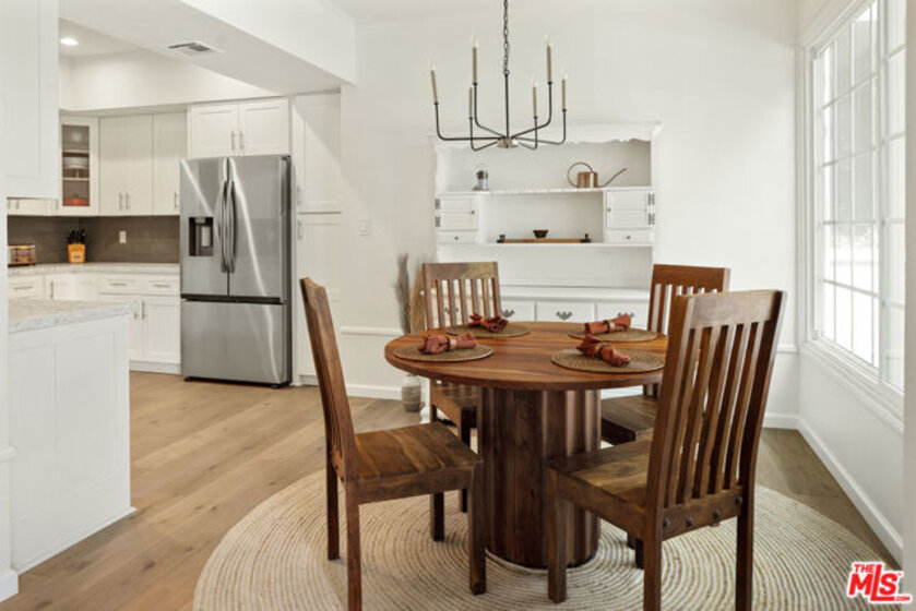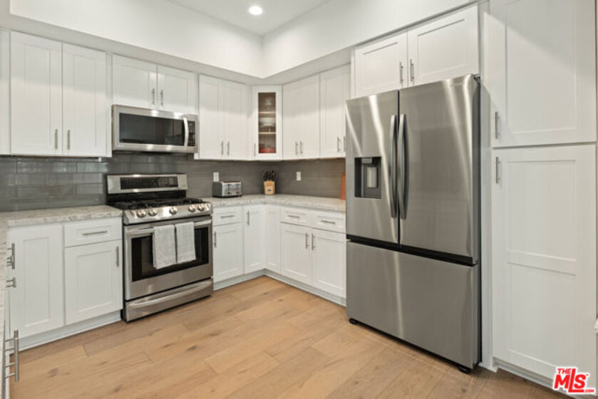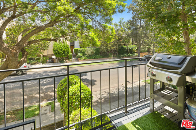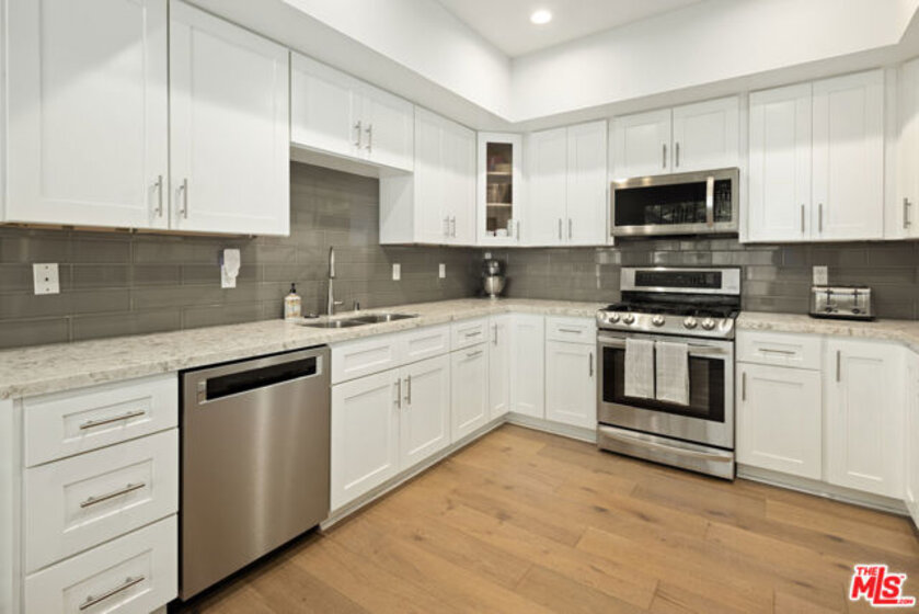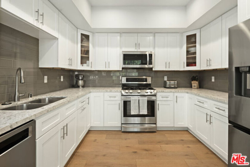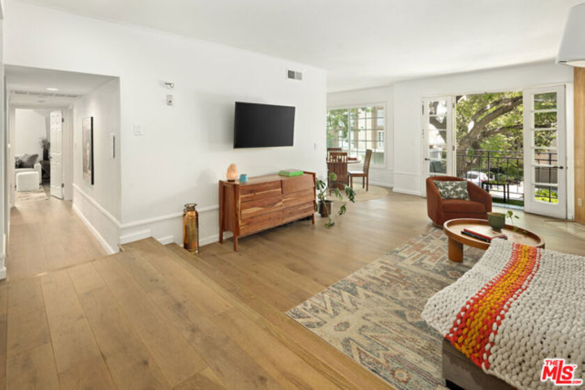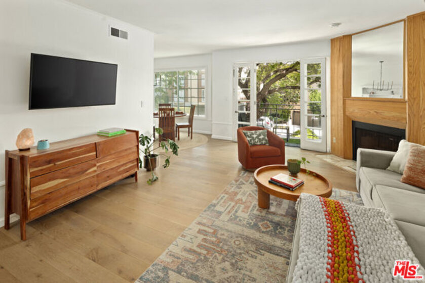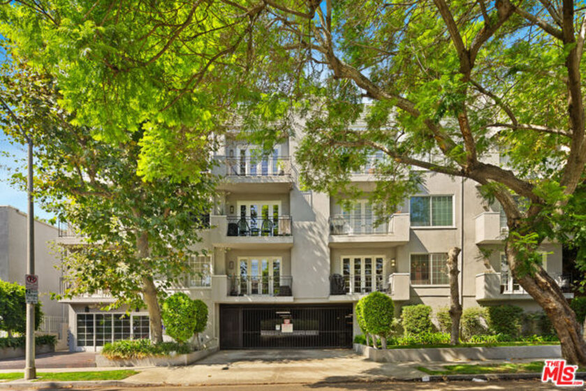 Sophisticated and welcoming, this front-facing contemporary residence combines airy proportions with charming European character. Set above street level, the single-story floor plan spans 1,270 sq.ft. with natural light streaming throughout. The living room opens through elegant French doors to a balcony shaded by mature maple trees, while the adjacent dining area enjoys a leafy street view. The remodeled kitchen features crisp white shaker cabinetry and stainless steel appliances. The spacious primary suite includes double French doors to a private balcony, generous closets, and an ensuite bath with dual vanity. A second bedroom offers flexibility as a guest room or office, served by a full hall bath. Additional highlights include a large laundry room with storage, two tandem garage spaces plus extra storage, and secure guest parking. HOA dues include earthquake Ins, water, trash and basic cable, and internet. Ideally located near Westwood Village, Century City, the new Google campus, and freeway access, this is Westside living at its most effortless.