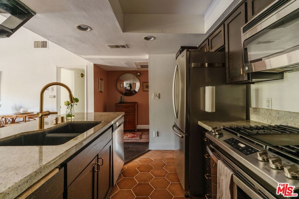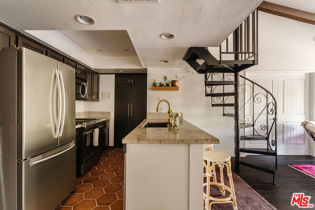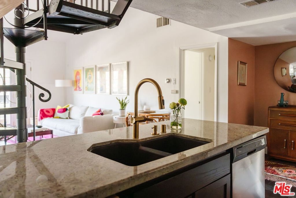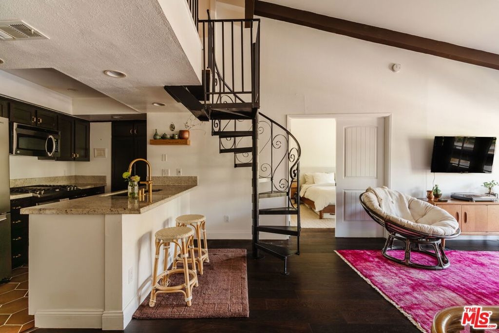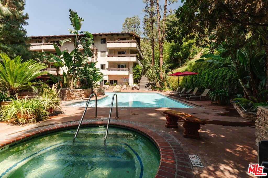 Welcome to 2700 Cahuenga Blvd #4319, a timeless Spanish retreated bathed in golden afternoon light with serene hill views. This soulful retreat offers an inspiring blend of updated warmth and character. The chic kitchen features wood cabinetry with ample storage, stylish hexagon tile, and a welcoming breakfast bar that ties the living room together seamlessly with new floors throughout. French doors open to a private balcony for sunset moments, while soaring vaulted ceilings with exposed beams elevate the living space. Two spacious bedrooms include an oversized primary suite with a remodeled bathroom and walk-in closet. A dramatic spiral staircase leads to a versatile loft, ideal as an artist's studio, music space, or creative escape. Complete with in-unit laundry, brand new AC, assigned parking and ample guest parking, and HOA dues covering key utilities including internet, cable, water, trash and earthquake insurance. A true Hollywood gem, offering on-site pools, spas, tennis courts, dog park, and gated entry. Tucked in the Hollywood Hills, just moments from the energy of Hollywood, Studio City, and beyond. This is a refined haven for creatives seeking both inspiration and ease.