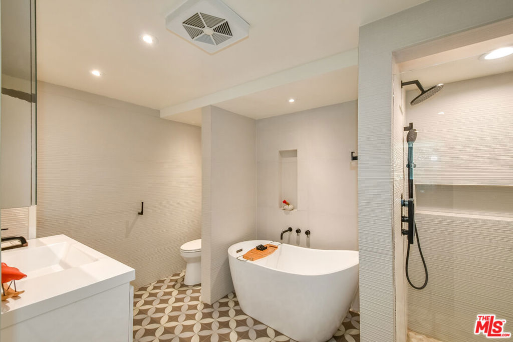 Beautifully remodeled and spacious 1-bedroom retreat with serene tree-top views set quietly in one of Brentwood's most sought-after enclaves. Floor-to-ceiling windows create a dramatic living space with incredible natural light, while multiple sitting areas offer flexibility for lounging, working, or entertaining. The thoughtfully designed layout includes both a dedicated dining area and a breakfast bar, seamlessly connecting to a chef's galley kitchen with abundant storage. The home has undergone extensive renovations, including all-new windows, a fully redesigned bathroom, refinished wood flooring, and new carpet making it truly move-in ready. The bathroom is elegantly appointed with a freestanding soaking tub and separate shower, creating a refined, spa-inspired feel without sacrificing function. The oversized bedroom features a wall of windows, custom built-ins, and an expansive walk-in closet. Storage is plentiful throughout the home. Located in a gated community with secured assigned parking, residents enjoy resort-style amenities including two pools and a spa with poolside bathrooms, a large park, and a fenced dog park. Ideally located just moments from Brentwood Village with local favorites such as Clark Street Bakery, and the iconic Brentwood Country Mart. Offered with the option to be delivered furnished.