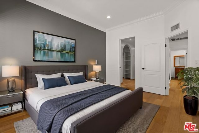 Welcome to this beautifully designed, light-filled penthouse that blends modern style with functionality. Featuring 3 bedrooms, 3.5 bathrooms, and 1,835 SF of living space, this sophisticated unit boasts soaring 14-foot ceilings, oversized windows, recessed lighting, and a cozy decorative fireplace. The main floor includes two spacious bedrooms, with an oversized primary bedroom with luxurious bathroom. An updated kitchen with top of the line stainless steel appliances opens to the dining area and offers ample storage and counter space. A spiral staircase leads to a flexible loft-style third bedroom, complete with custom built-ins and its own en-suite bath ideal as a home office or guest suite. French doors open to a private rooftop deck, a true oasis featuring a grill, overhead heater, and Moroccan-inspired seating area, perfect for entertaining. Additional highlights include in-unit stacked laundry and two-car tandem parking. Just one block from Beverly Hills and 3rd Street, this prime location puts you steps from trendy cafes, boutiques, and moments from Cedars-Sinai.