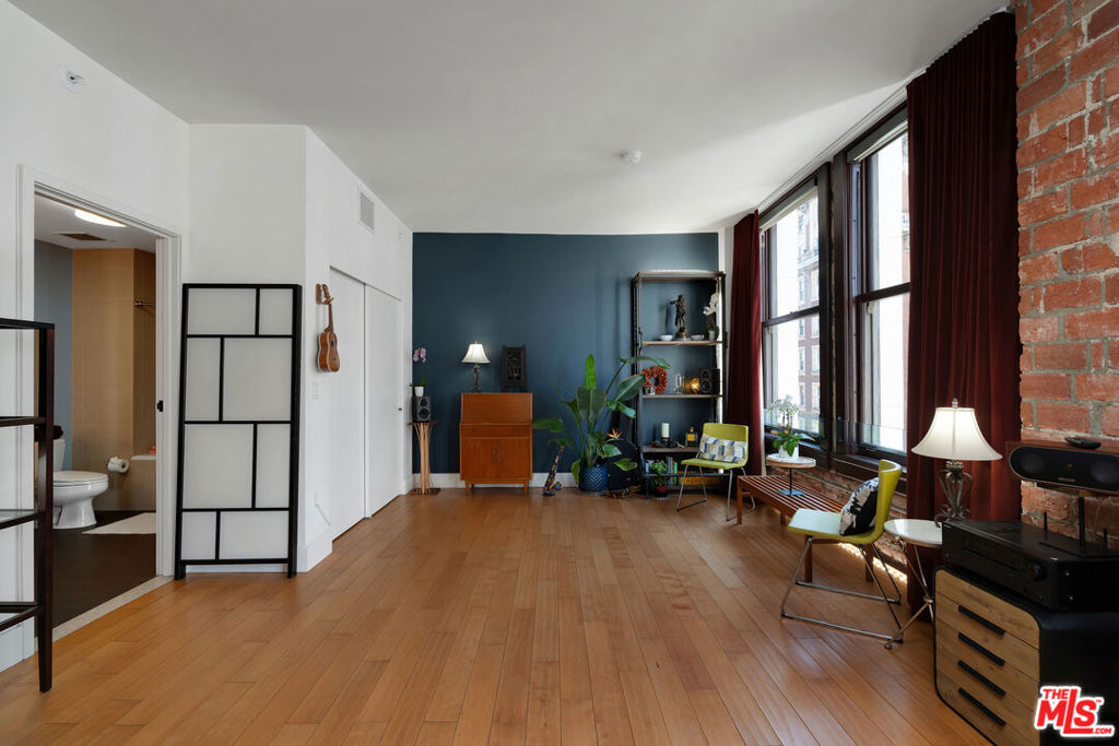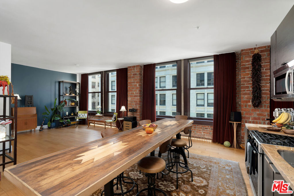 High style and cool vibes come together in this sunny and serene 1-bedroom, 2-baths DTLA loft in the iconic Rowan Building. This south-facing 8th floor condo has all-day light and skyline views along with dramatic high-ceilings, gorgeous hardwood floors, 6 huge windows, and exposed brick walls. Phillips Hue lighting lets you set the mood, while custom-made floor-to-ceiling blackout velvet curtains give you ultimate privacy. The expansive, spacious layout gives you one ensuite bathroom, and a second full-bath off the oversized living room. The gourmet kitchen features quartz counters, stainless appliances and tons of storage. Central heat & A/C, and in-unit stacked washer/dryer. The building's MILLS ACT designation gives owners substantial yearly property tax savings up to 70%. Residents enjoy a beautifully restored lobby and hallways, 24-hour front desk and reception, controlled building and common-area access, a 2nd floor WIFI-enabled lounge, outdoor gardens, outdoor plunge pools, and BBQ grills. Grand Central Market, Spring Street Dog Park, Metro, Gallery Row, Little Tokyo and tons of live-music venues are all nearby. Parking available for rent.