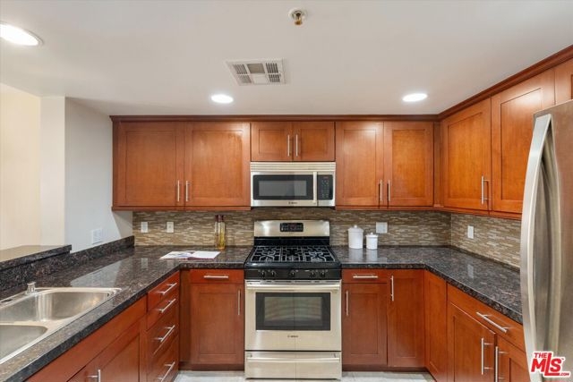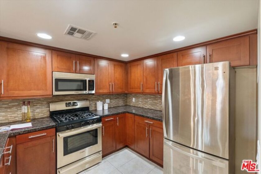 Welcome to this beautiful 2-bedroom, 2-bathroom condo offering a perfect combination of style, comfort, and convenience in one of the Westside's most desirable locations. The gourmet kitchen is a chef's dream, featuring sleek granite countertops, Bosch stainless steel appliances, and generous cabinetry ideal for both everyday living and entertaining. The open-concept living and dining area showcases rich dark wood flooring, fresh paint, and flows seamlessly onto an oversized private patio, with direct access from both bedrooms and the living room. Perfect for indoor-outdoor living and hosting guests. The spacious primary suite includes dual closets, including a walk-in, and a luxurious en-suite bathroom complete with dual vanities, a soaking tub, and a separate glass-enclosed shower. Additional features include in-unit laundry with a stackable washer and dryer, and central air and heat. Residents enjoy a full suite of amenities, including a sparkling pool and spa, fitness center, recreation room, stylish lounge areas, secured entry, gated parking with two assigned spaces, and two guest spots. Centrally located near the 405 freeway, Westfield Culver City, Playa Vista, Marina del Rey, LAX, and just minutes to the beach this home offers the best of Westside living!