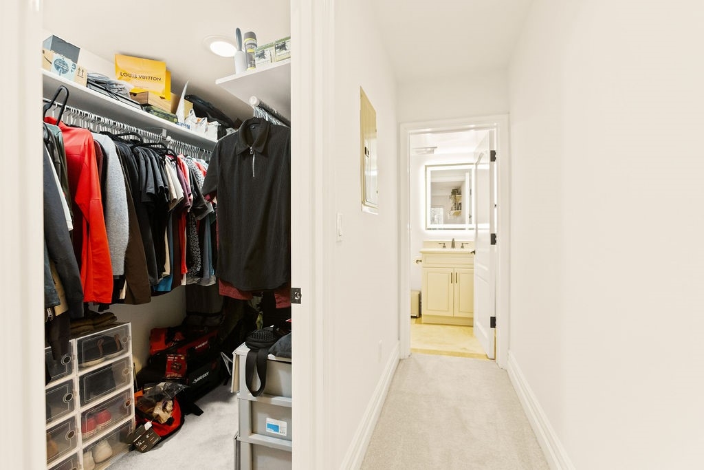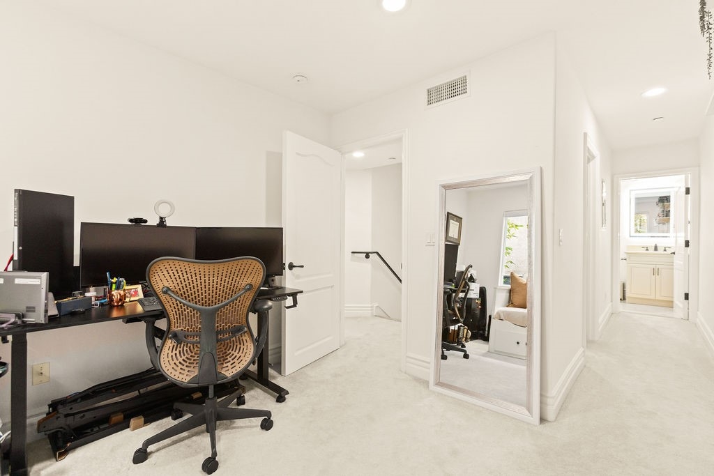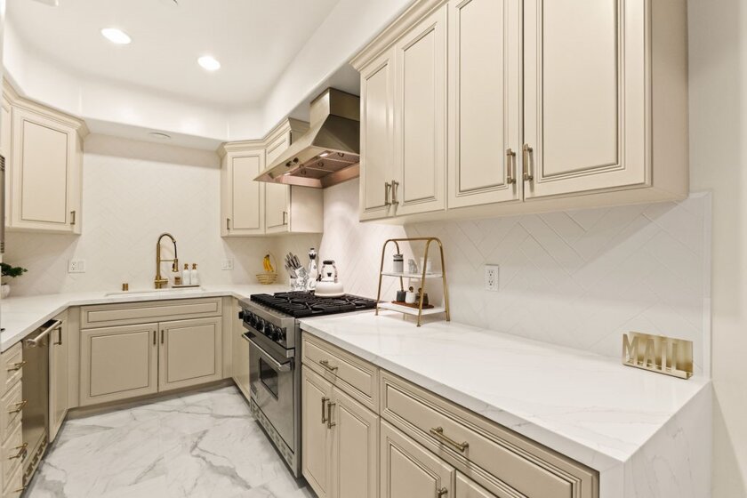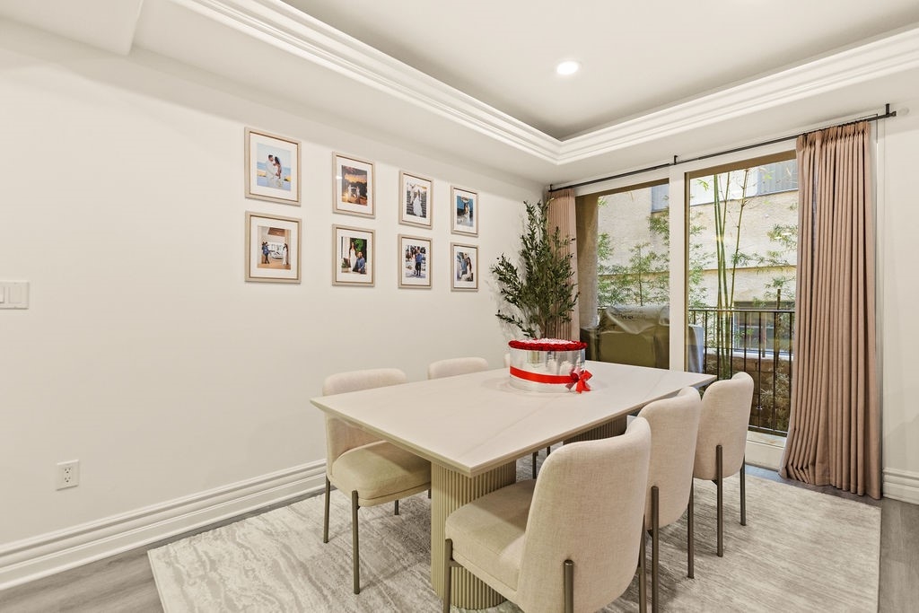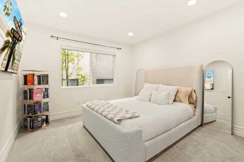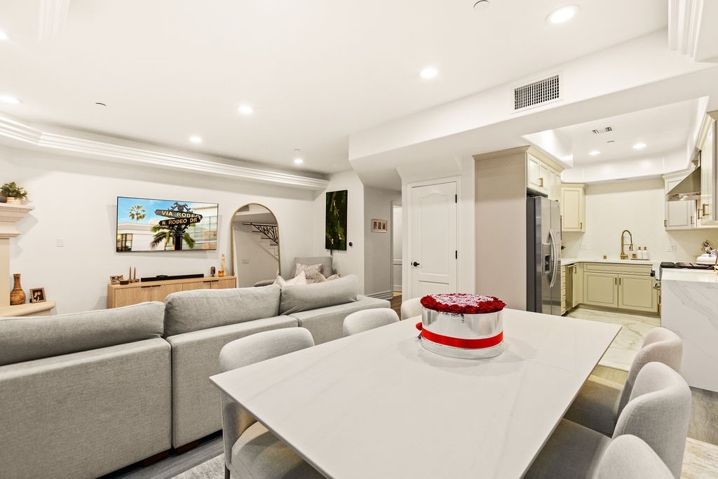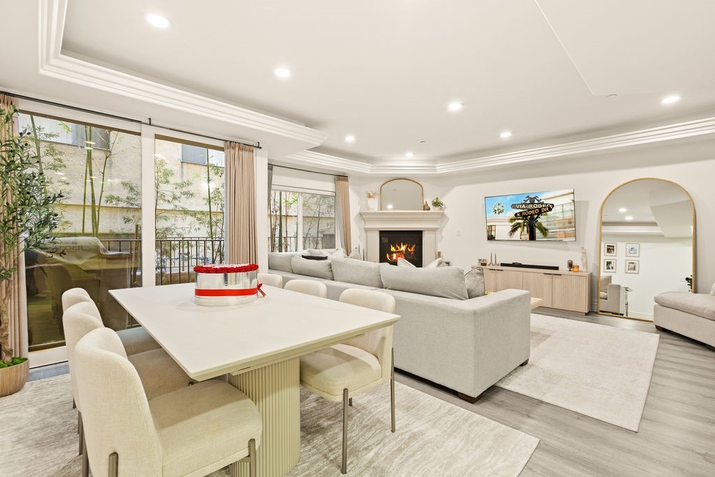 Experience refined living in this beautifully remodeled two bedroom, two-and-a-half bath "townhome style" residence, perfectly blending contemporary design with timeless sophistication. Thoughtfully designed, both bedrooms are located on the upper level, each featuring its own elegantly appointed en-suite bath, while a chic powder room on the main floor offers convenience for your guests. The remodeled gourmet kitchen showcases high-end Viking appliances, custom cabinetry + ample "Calacatta Style" quartz counter-tops with a waterfall edge. The kitchen flows seamlessly into the dining and living areas. The open-concept design is enhanced by custom crown molding, refined finishes, and a cozy gas-burning fireplace that anchors the living space with warmth and style. Additional amenities: central air conditioning; luxury vinyl flooring; stylish porcelain flooring in kitchen and powder room; stackable washer/dryer closet on 2nd floor; voice command lighting and window coverings; private balcony; exceptional closet space (2 walk-ins in primary bedroom) + additional mirrored wardrobe; spacious walk-in in guest bedroom; dual vanity in primary bedroom + soaker tub & separate shower; 2 secured/assigned tandem covered parking spaces & the list goes on... Centrally located near La Cienega’s famed Restaurant Row, The Beverly Center, The Grove, and more — this exceptional home combines modern living with unbeatable convenience.